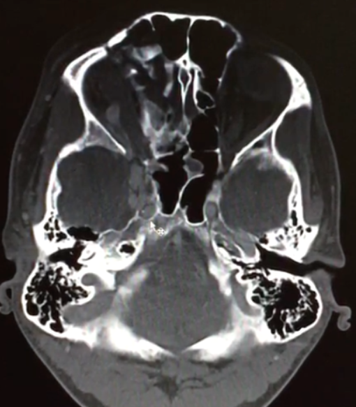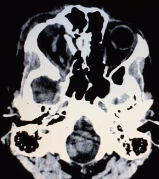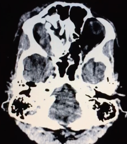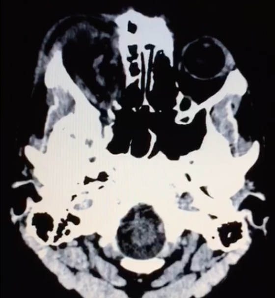- Tomografia de crânio estrutura captante com a invasão de contraste. Ausência de coleção purulenta e presença de lesão em topografia de seio cavernoso e evidência da veia oftálmica superior. Além disso, a TC mostra sinais de traumatismo prévio (fratura frontal).