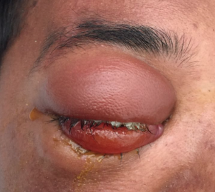 P.F.S, 36 anos, pardo, previamente hígido. Admitido com queixa de olho inchado”. Refere início de forma súbita há 1 (um) dia. Evoluiu com edema periorbitário, dor no local, eritema da conjuntiva. Nega febre, queixa de cefaleia de moderada intensidade em região frontal direita. Há 12 dias sofreu uma queda de motocicleta, com a qual teve um traumatismo crânio-encefálico (TCE) leve, tendo, na ocasião, fraturado o frontal direito e contusão frontal de tratamento conservador.